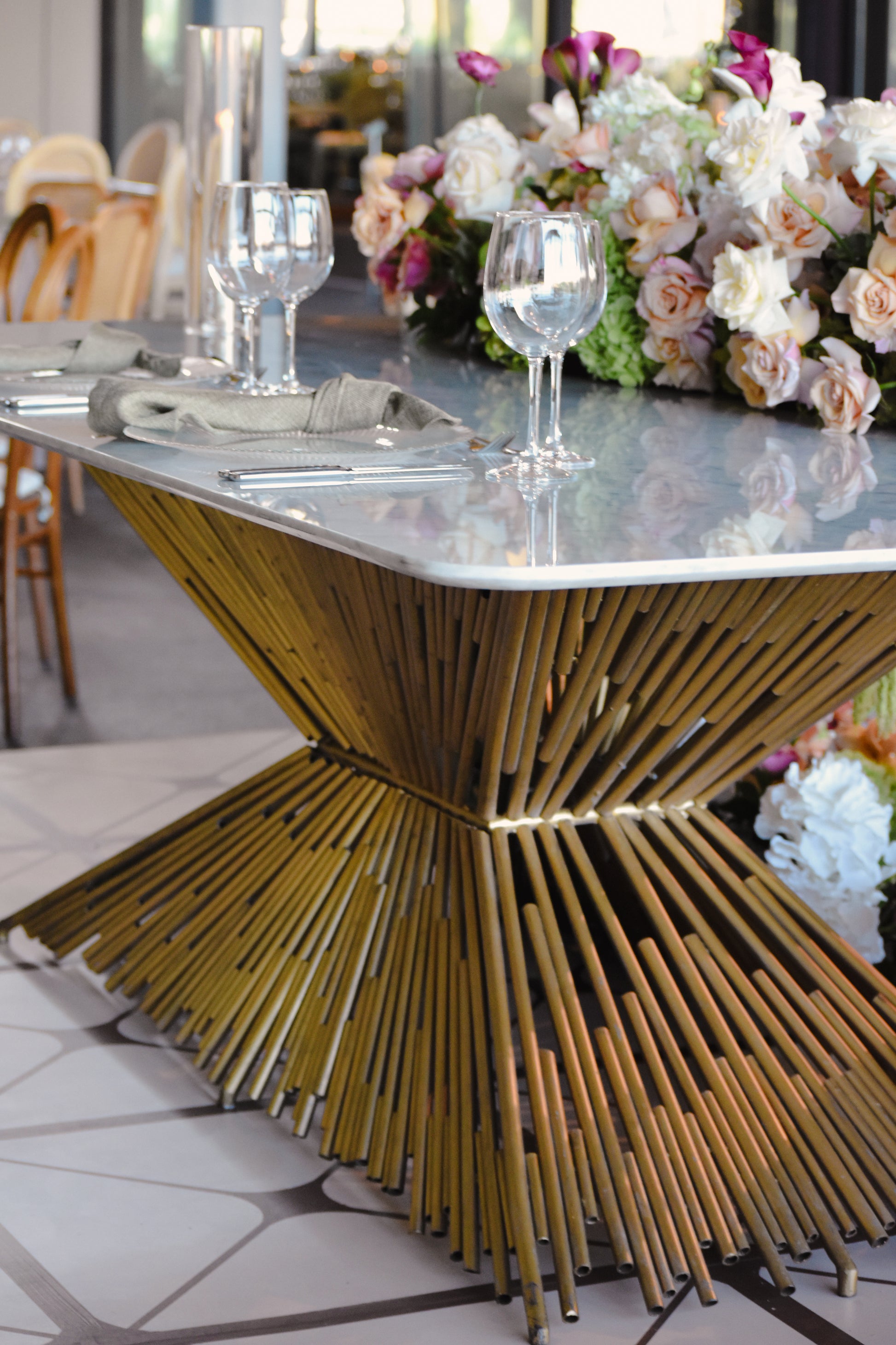 Mesa con base de herrería dorada y cubierta rectangular calacata