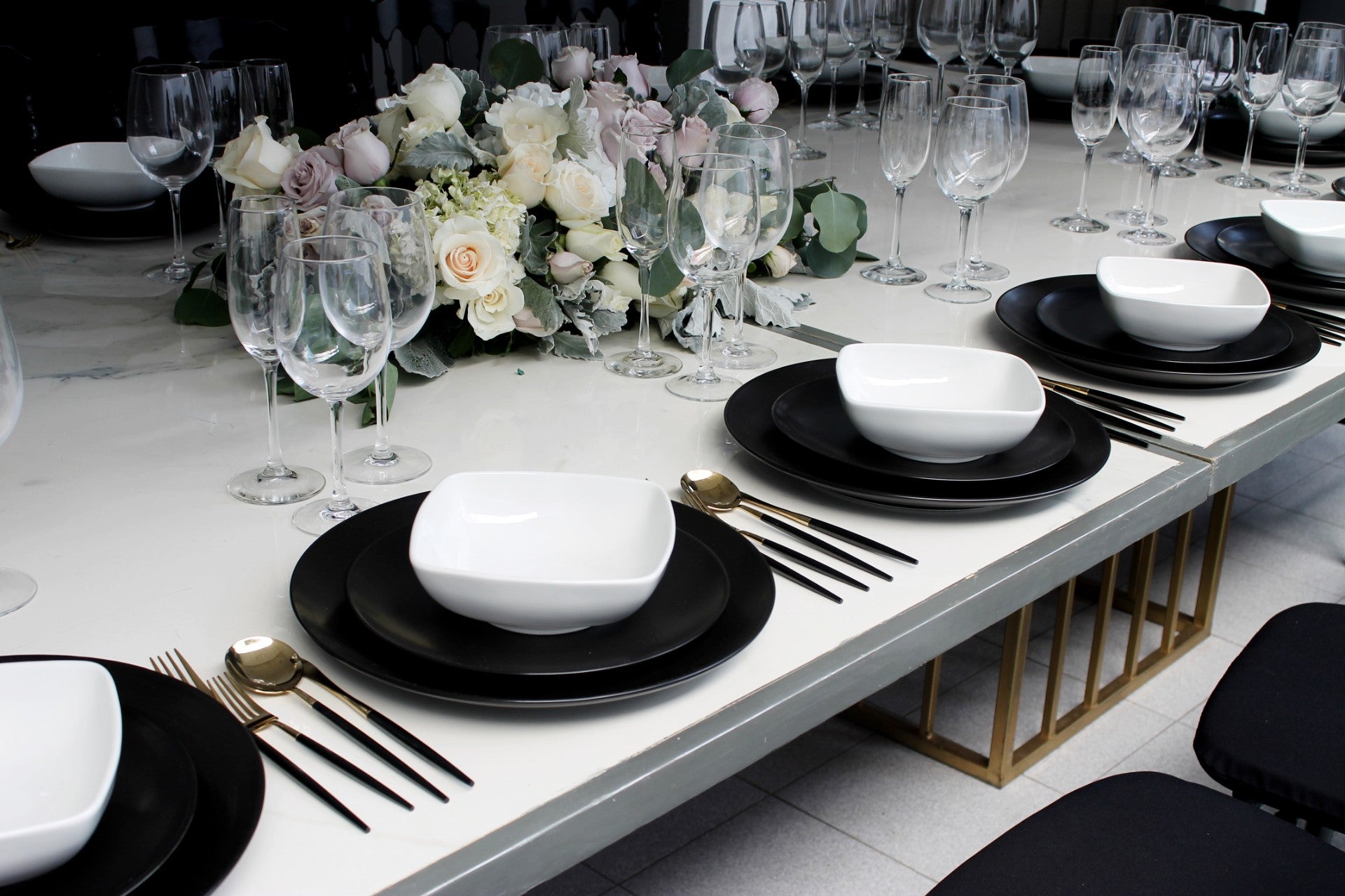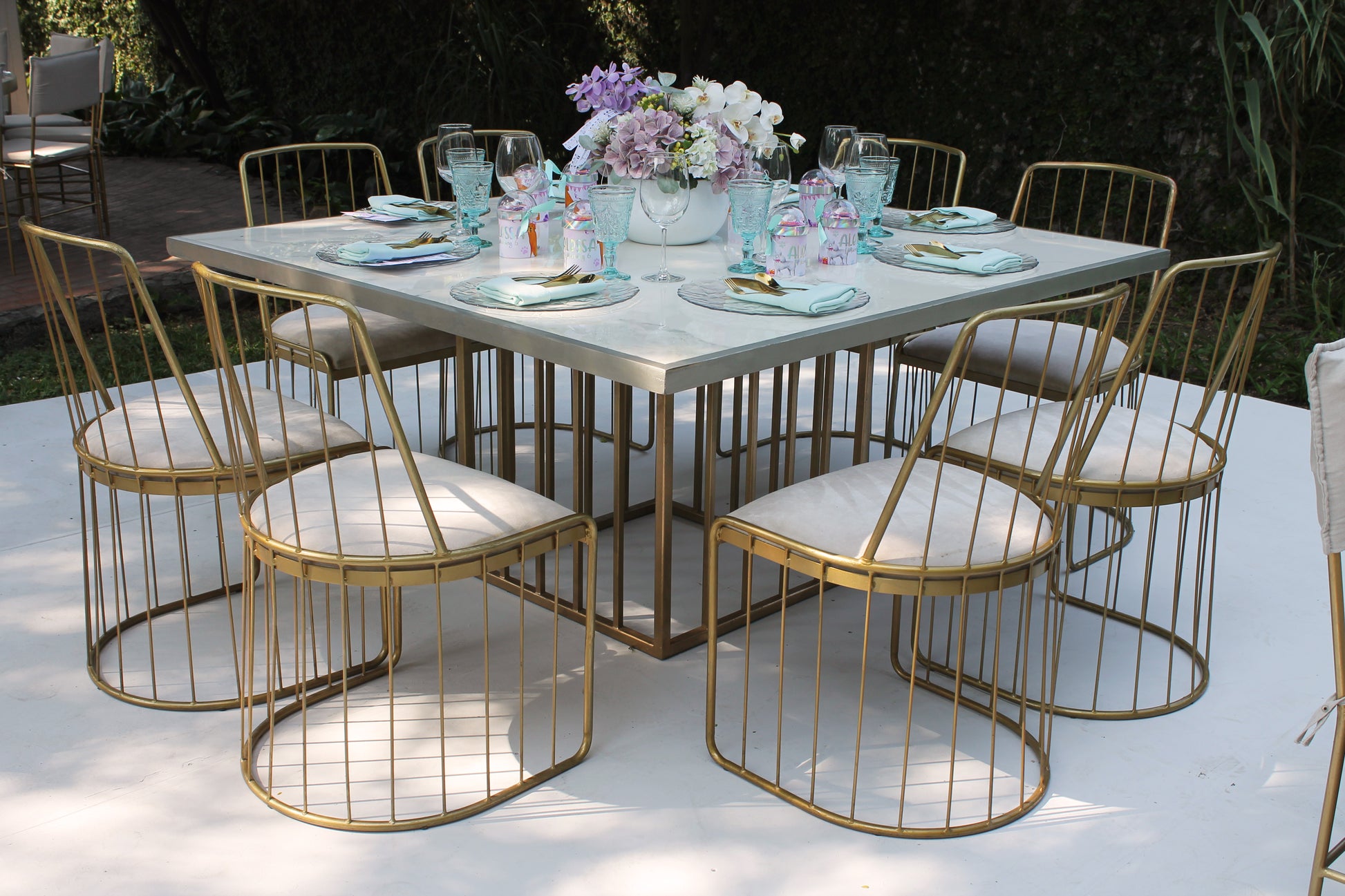 Mesa cuadrada con base de herrería dorada y cubierta calacata