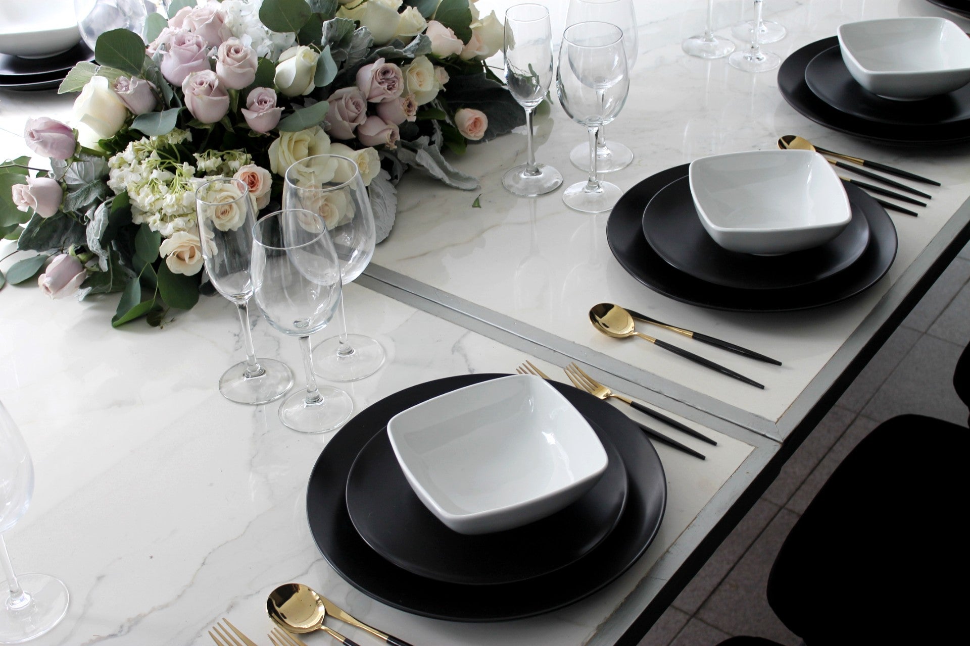 Mesa cuadrada con base cubo plata óxido y cubierta calacata