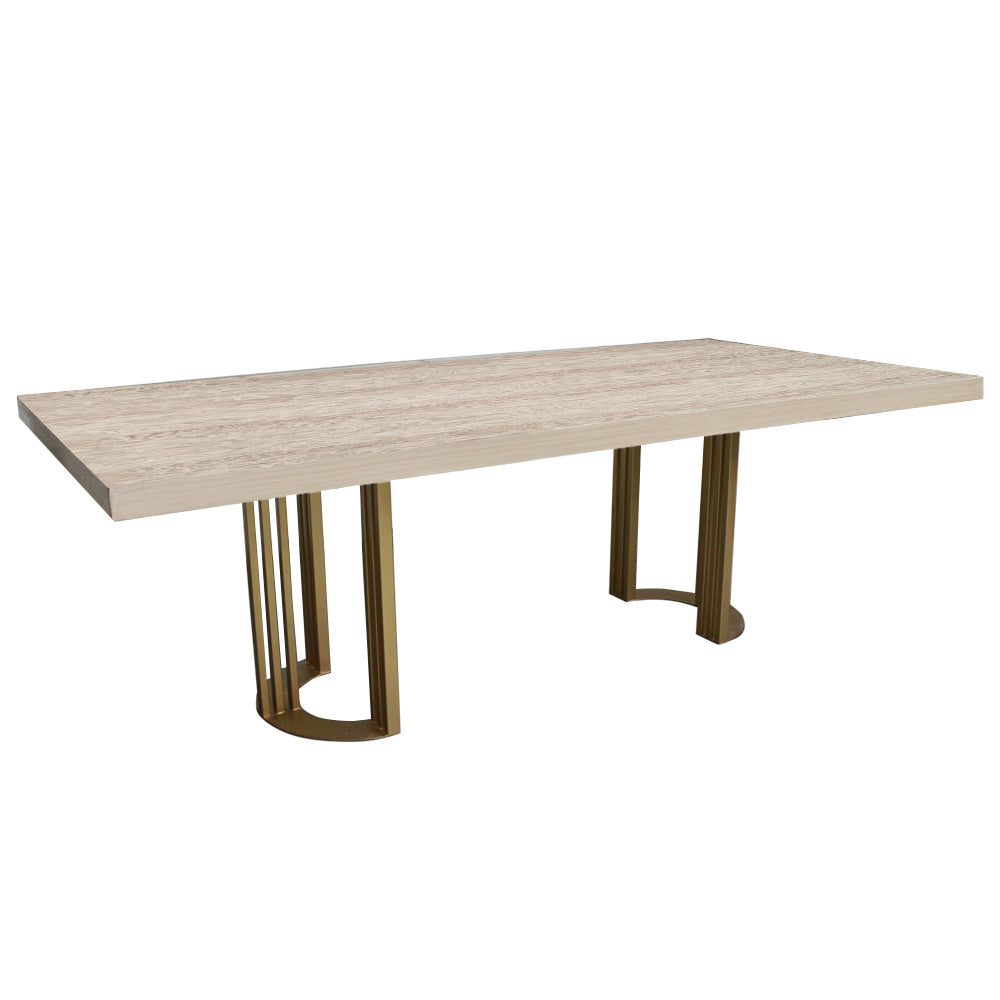 Mesa rectangular de madera con cubierta color hueso y base de herrería dorada