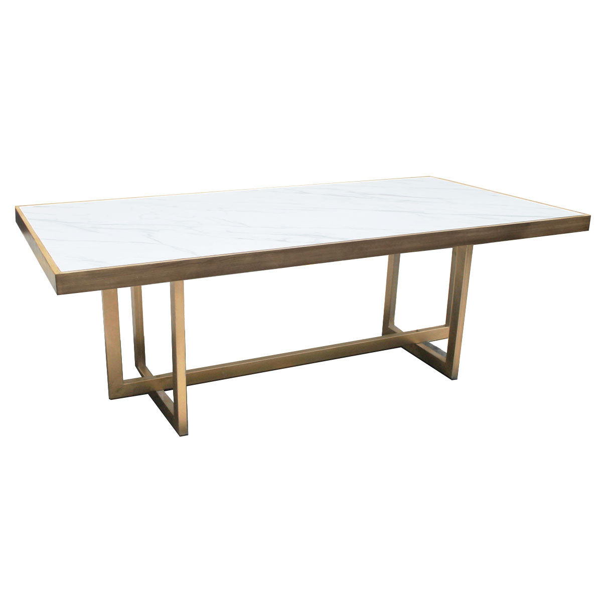 Cubierta rectangular carrara con bastidor color miel y base de herrería dorada