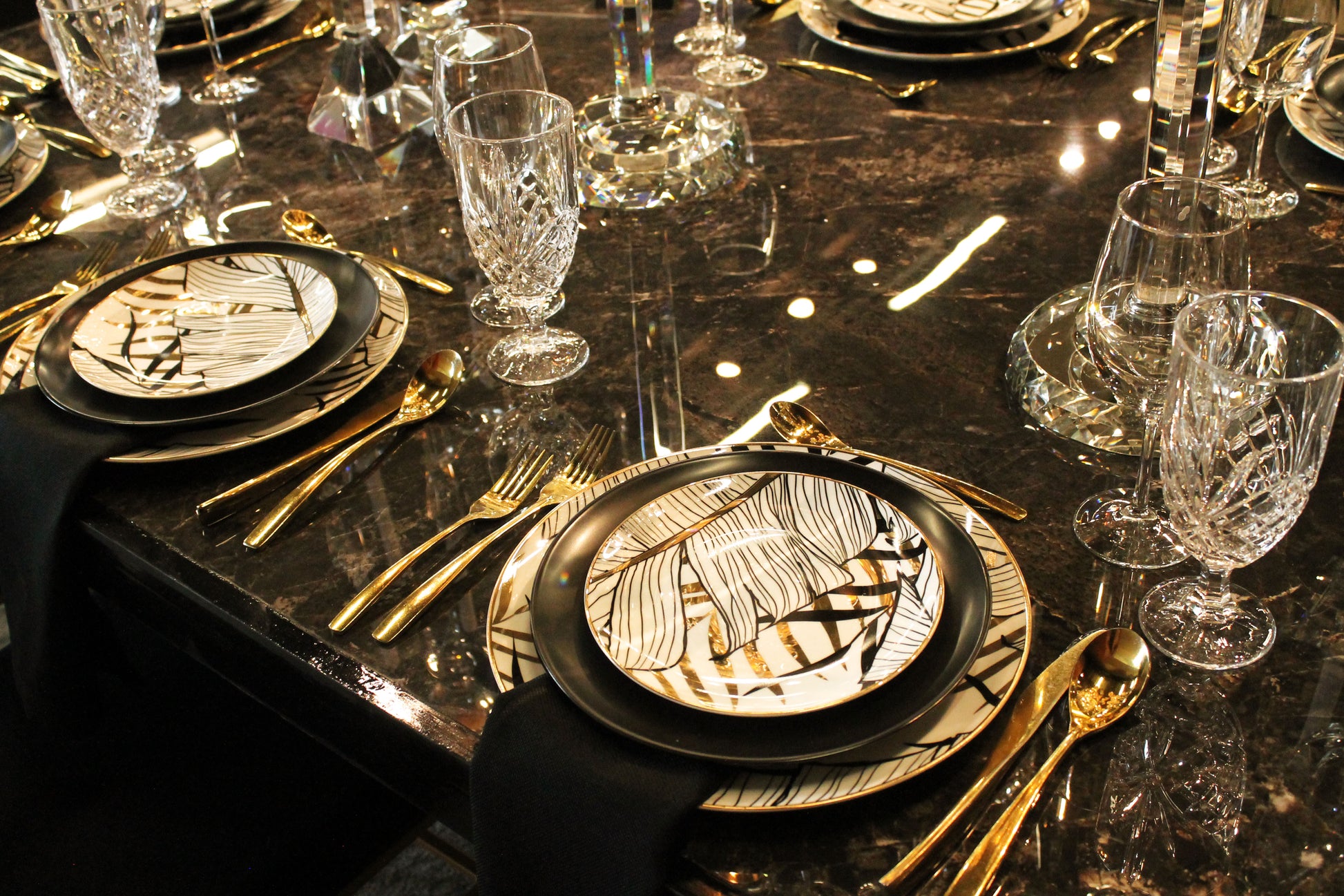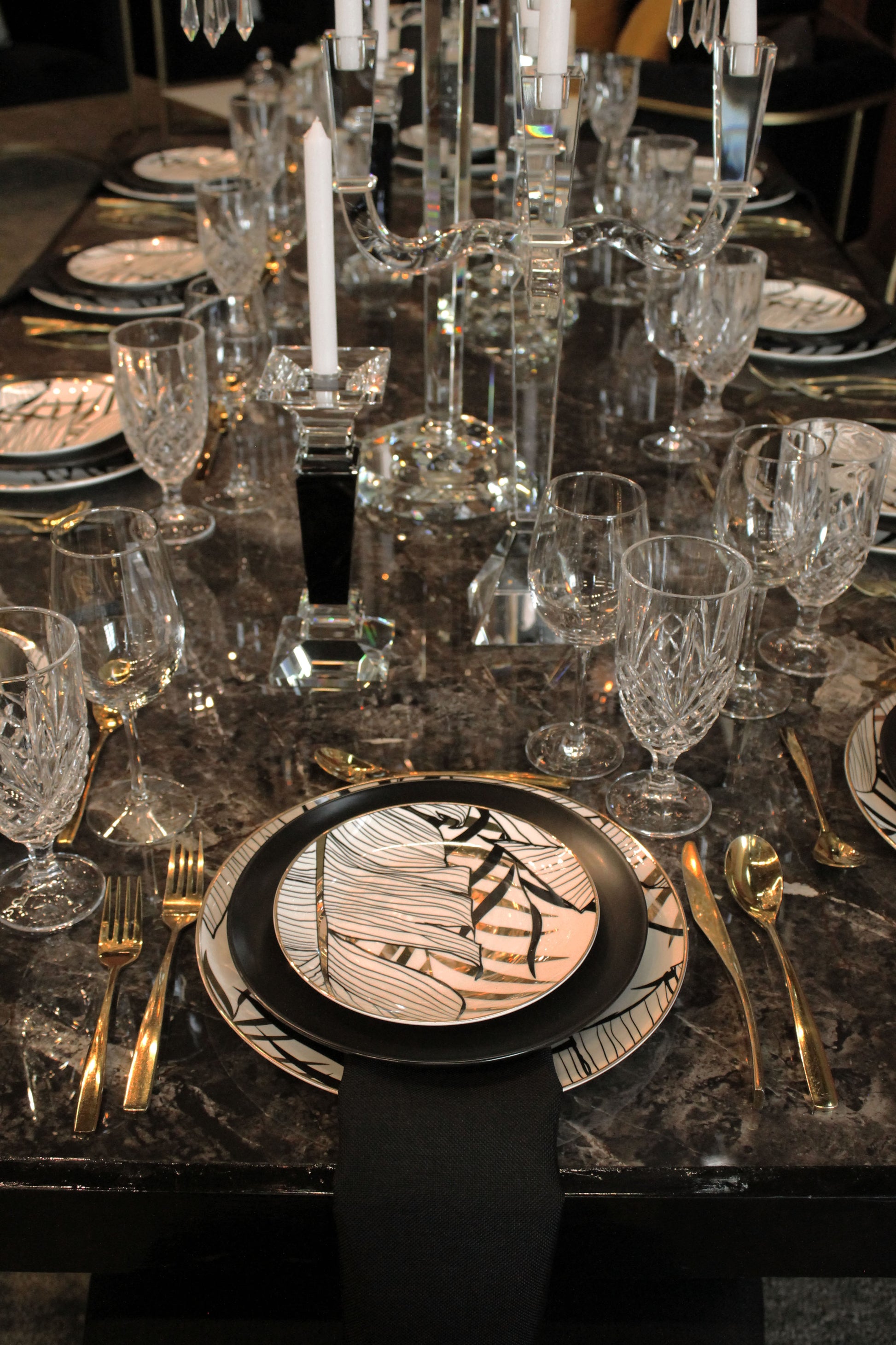 Cubierta rectangular marquina con bastidor color negro y base de herrería dorada