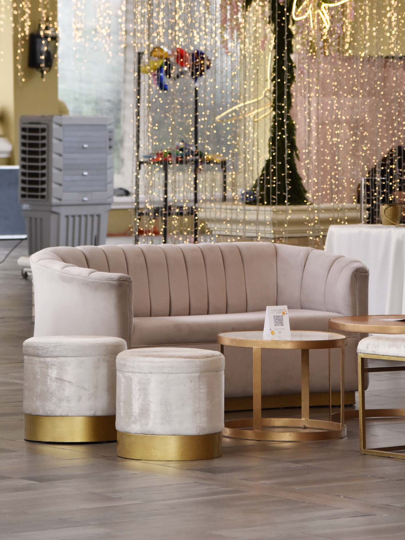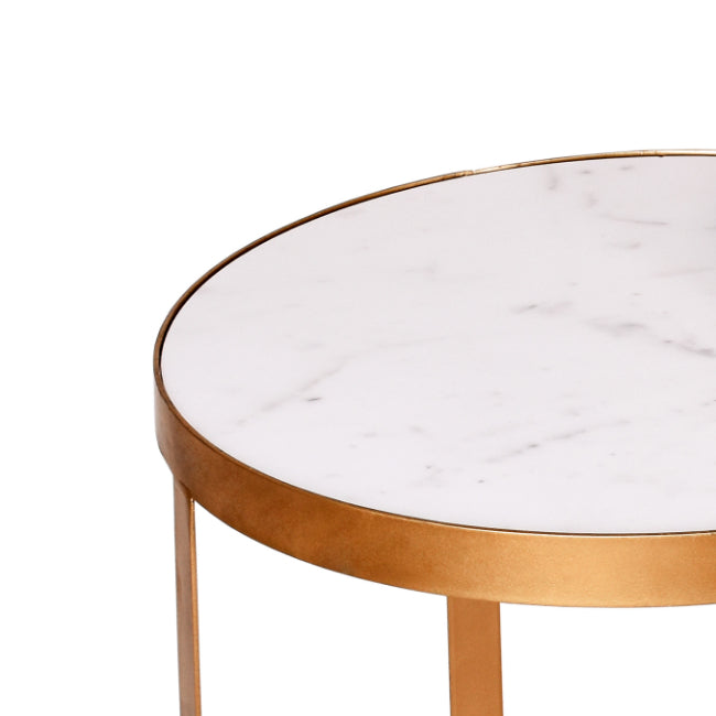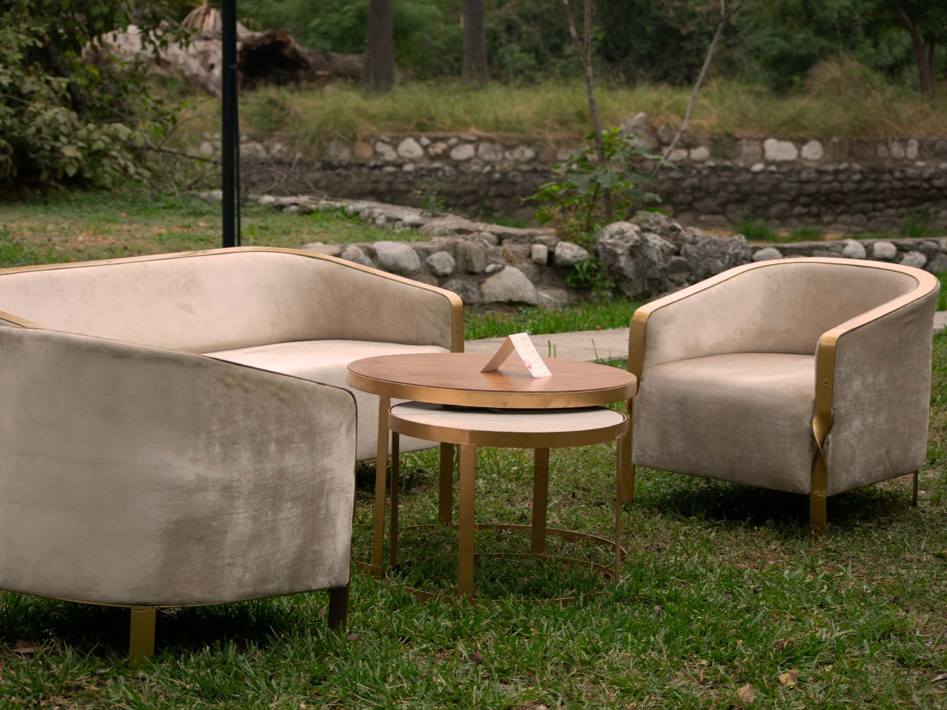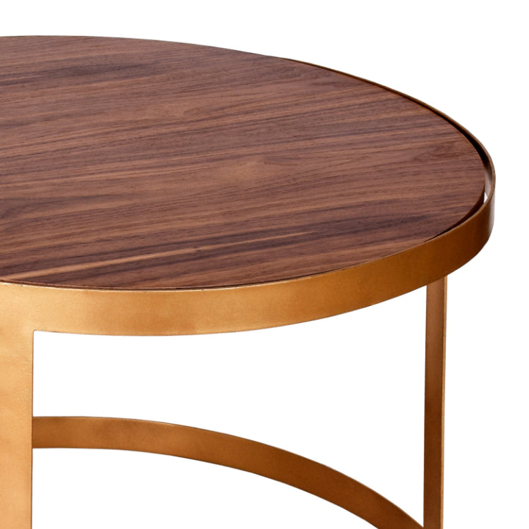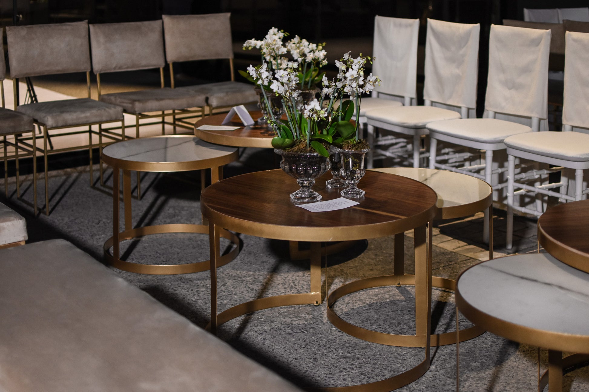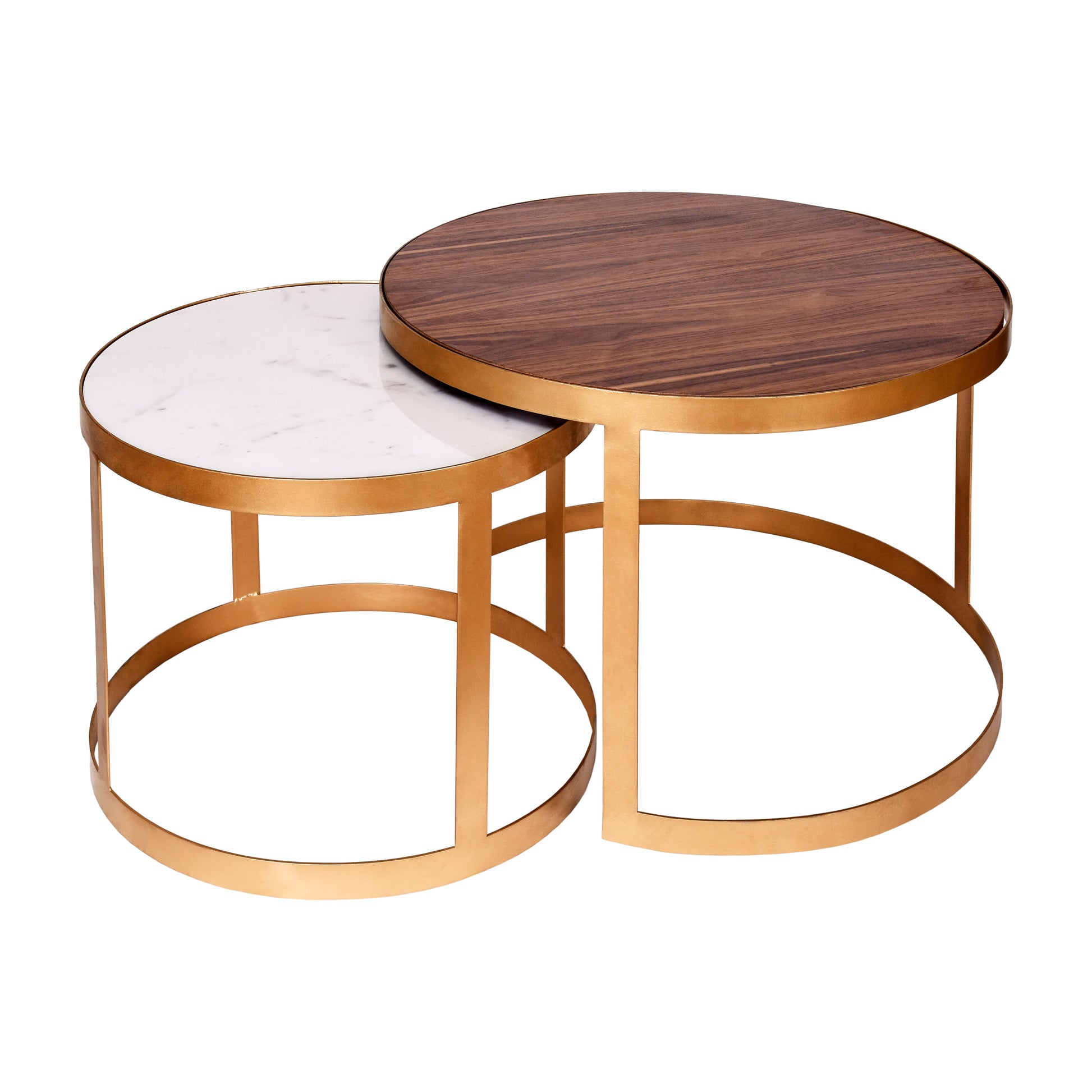 Mesas de herrería dorada y cubierta de mármol y nogal
