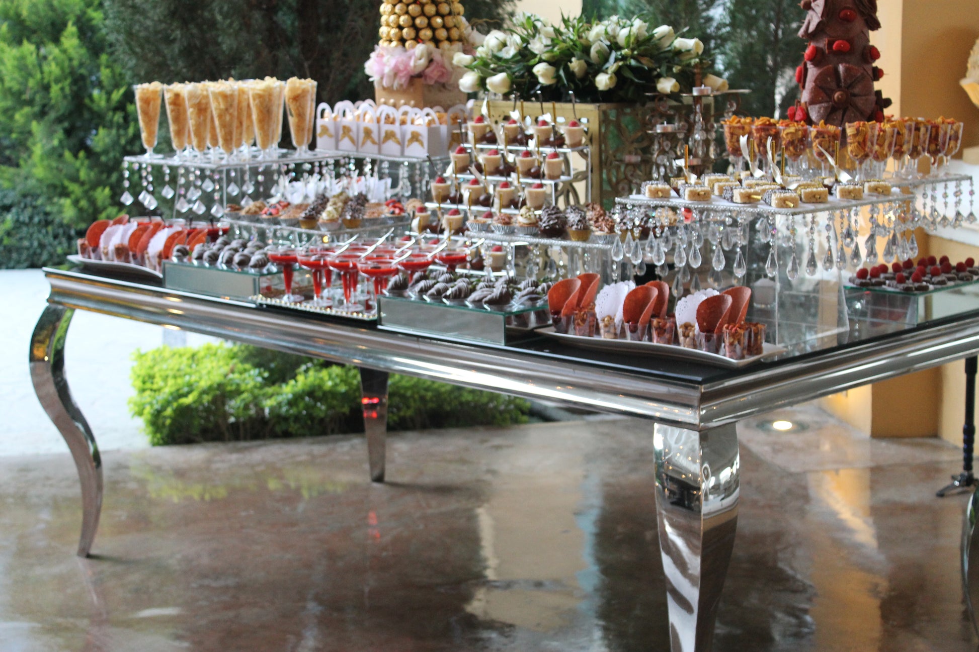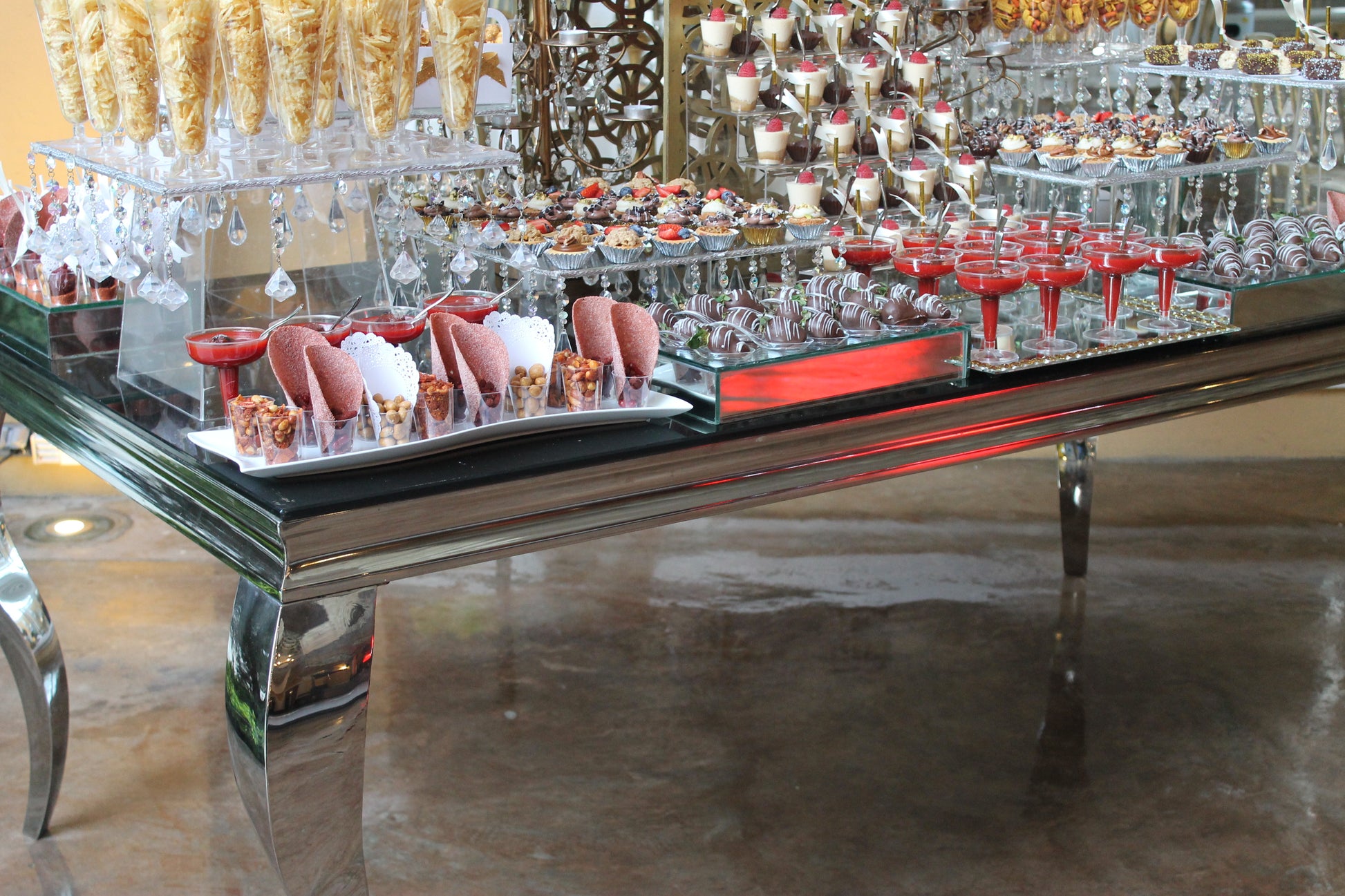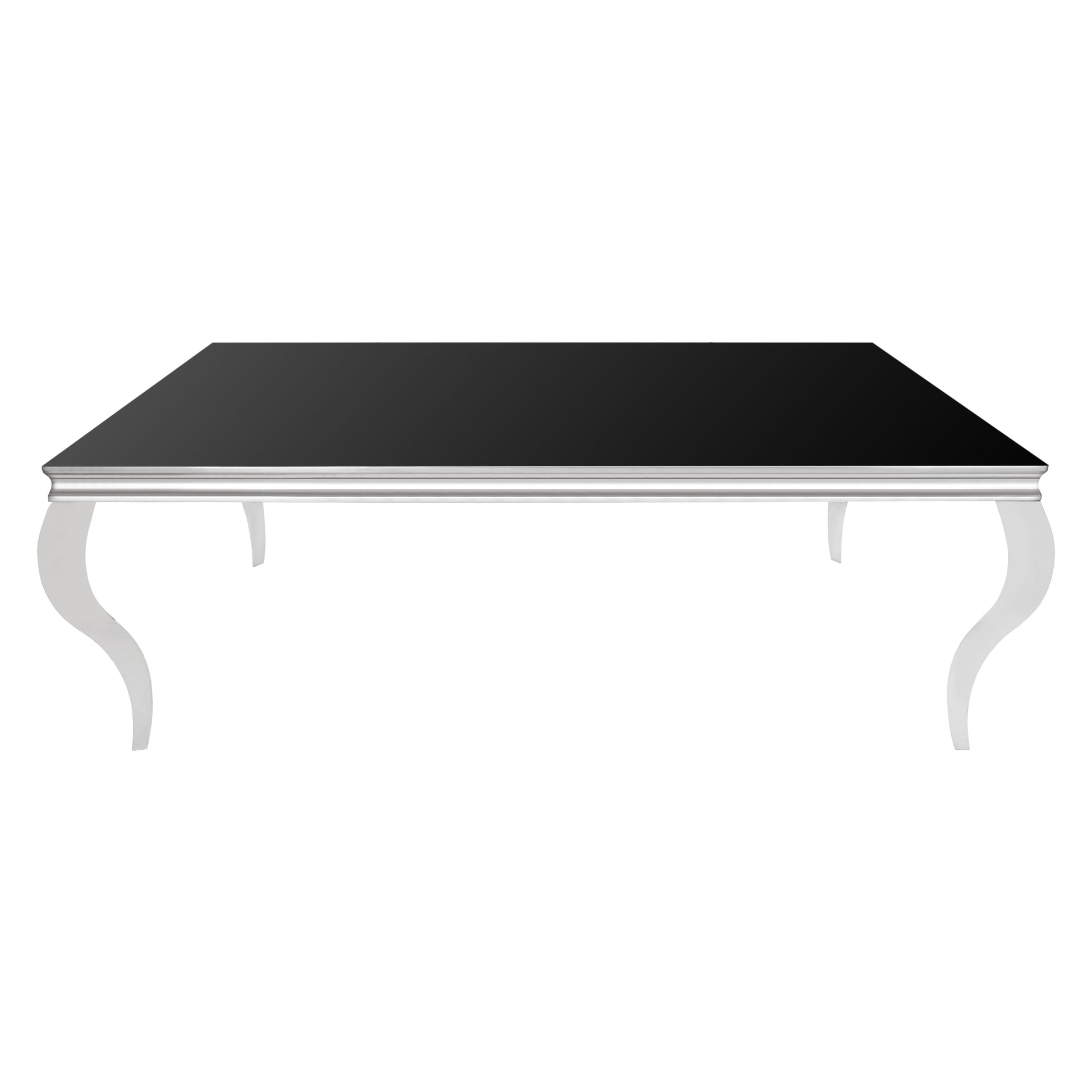 Mesa con base plateada y cubierta de vidrio negra