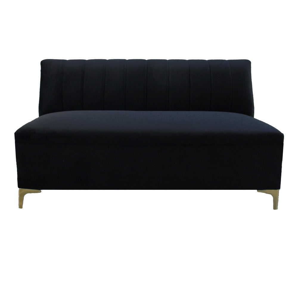 Sofá velvet negro con costuras en respaldo y patas color doradas